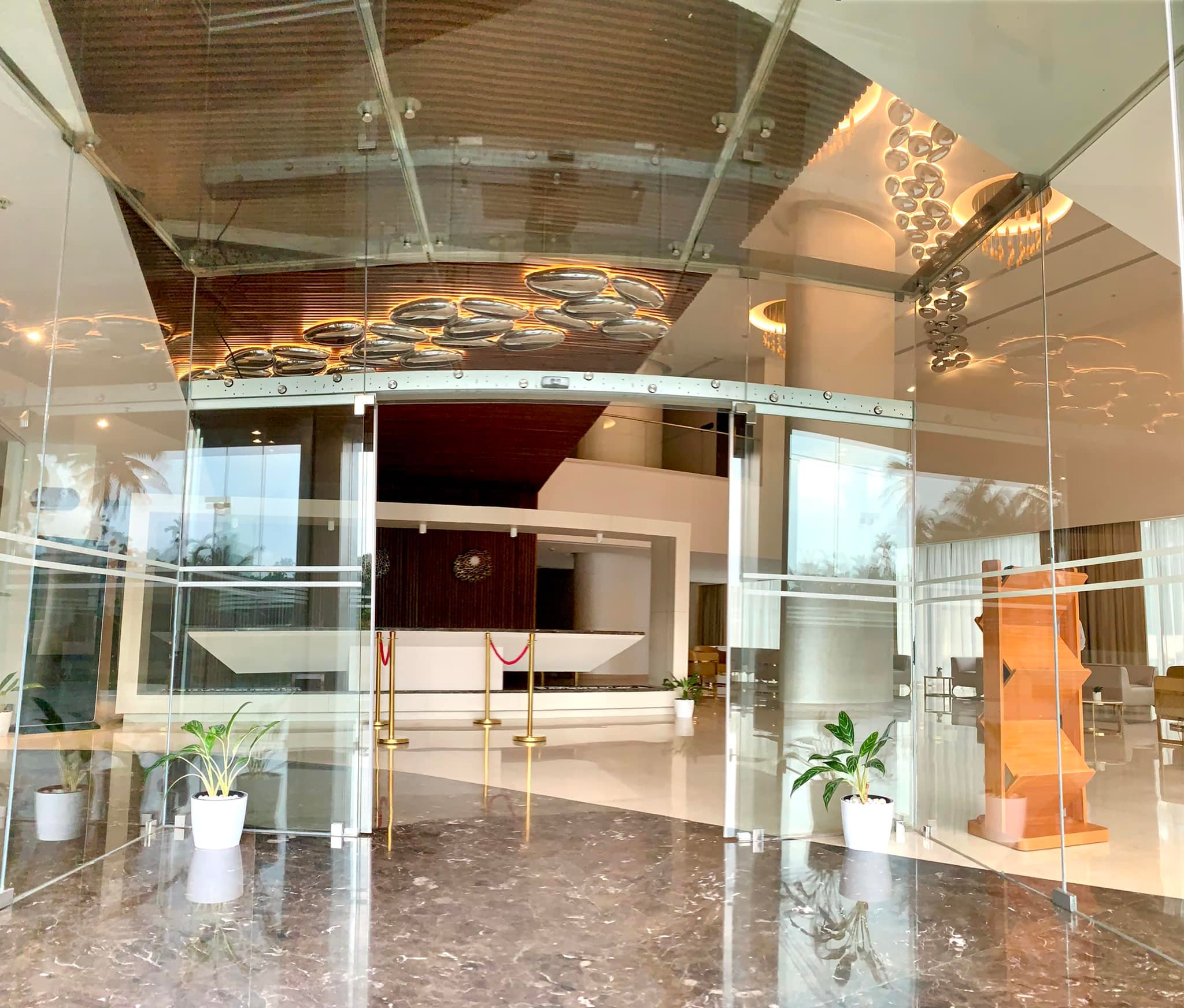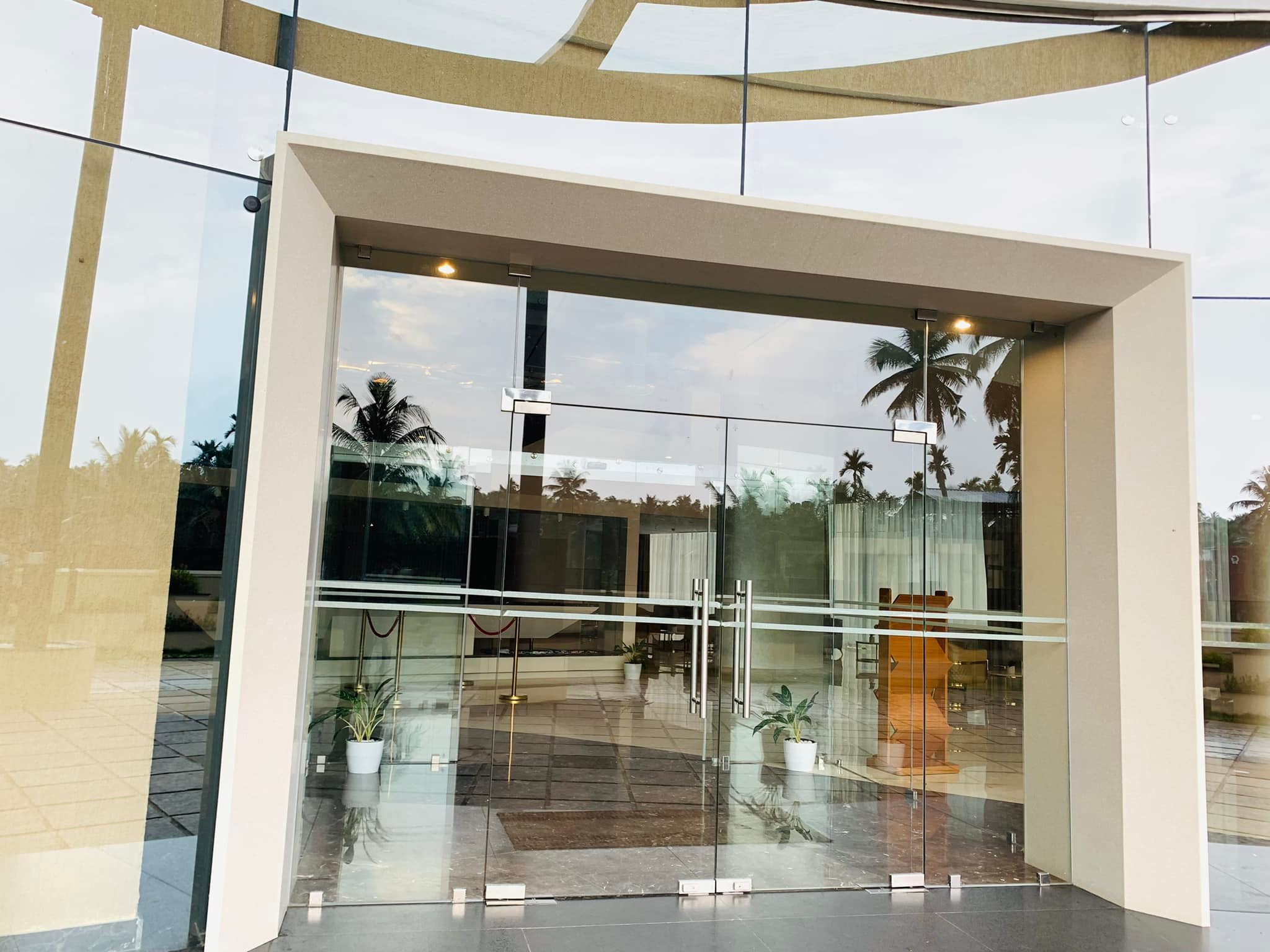 Hotel Dimora Calicut reflects a seamless blend of functionality, elegance, and precision-driven glass design works in Kerala. The project involved carefully engineered ceiling glass work that enhances natural light while maintaining structural integrity and visual balance. Automatic sliding glass doors were installed to ensure smooth access, modern appeal, and long-term performance suited for high-traffic hospitality environments. Laminated hanging ceiling glass work was executed with strict safety standards, creating a striking architectural highlight without compromising durability. The main entrance frameless door was designed to deliver a bold first impression while maintaining openness and transparency. MS supported glass canopy work in Kerala added both protection and architectural character, complementing the hotel’s exterior design. Shower glass partition works in Kerala were completed with precision detailing to ensure privacy, hygiene, and a refined guest experience. Fixed glass partition work was integrated across interior zones to maintain spatial flow while subtly defining areas. Profile glass handrails work in Kerala was crafted to enhance safety without interrupting the visual continuity of the interiors. Every element was planned, fabricated, and installed to align with hospitality-grade standards, ensuring longevity, safety, and visual excellence.