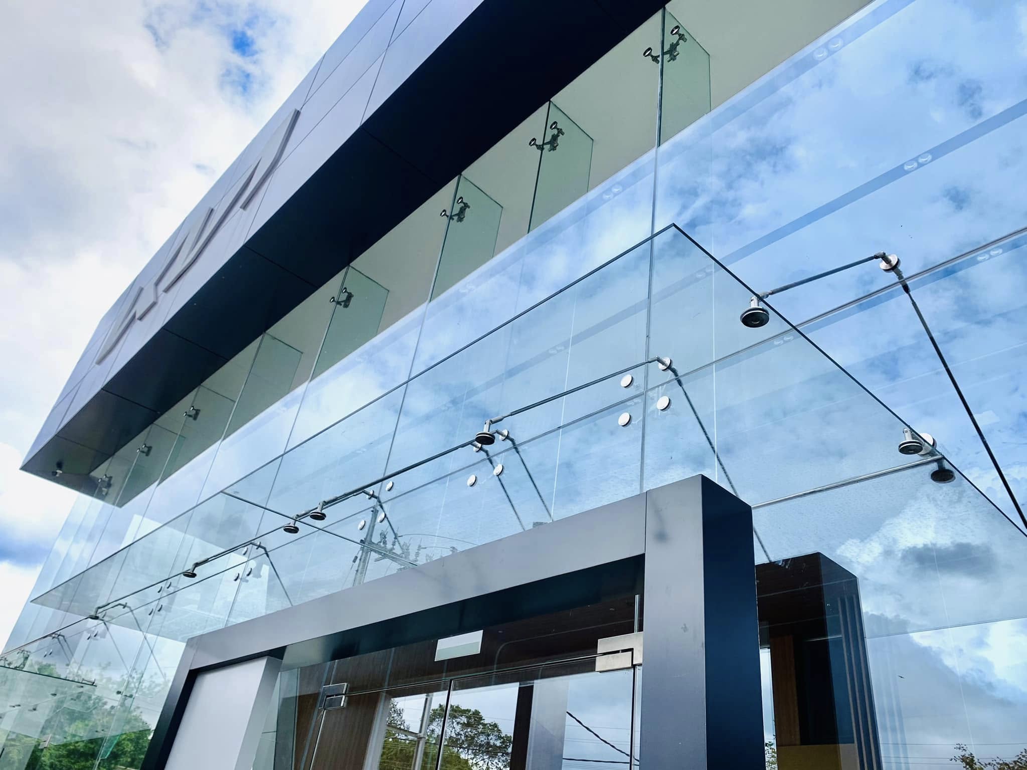 The spider glass façade delivers openness, clarity, and a premium showroom appeal, while the frameless glass doors create a seamless transition between interior and exterior zones. The glass stair handrails add a sense of lightness and modern sophistication, enhancing both safety and visual flow.