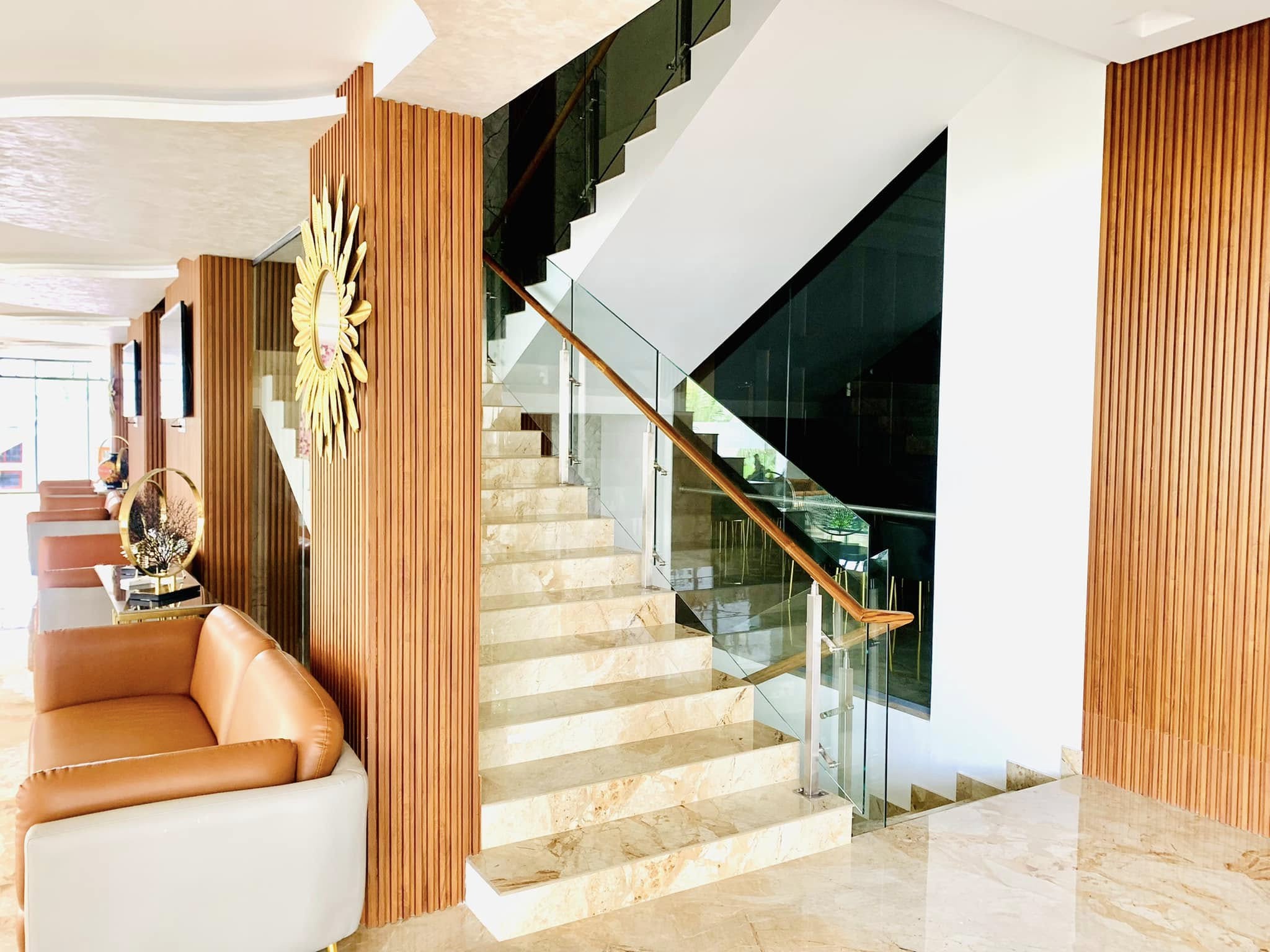 We complemented these glass installations with elegant louverwork, which not only adds a modern architectural flair but also improves ventilation and shading. Custom-designed wooden railings were paired with our signature glass handrail works, adding warmth and sophistication while ensuring maximum safety. High-quality aluminium windows and doors were installed with meticulous precision to provide durability, smooth operation, and a premium finish. Our team also executed fully automated automatic doors that enhance functionality for high-traffic areas, delivering a seamless visitor experience.